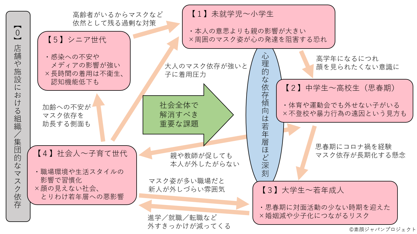 マスク姿が多い職場など集団での依存傾向により、コミュニケーション不足や業務効率の低下。 親がマスク依存になってしまったことによる子供世代への影響。 近所づきあいで顔が見えず、不審者との区別がつきづらいことによる治安・防犯面の懸念。 |